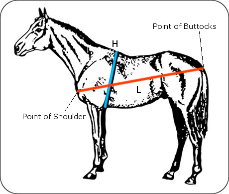 First get the pony standing straight and level, then measure the heart girth (H) using a tape measure that runs tightly around the pony, lying at the base of the withers and as close to the front legs as possible.